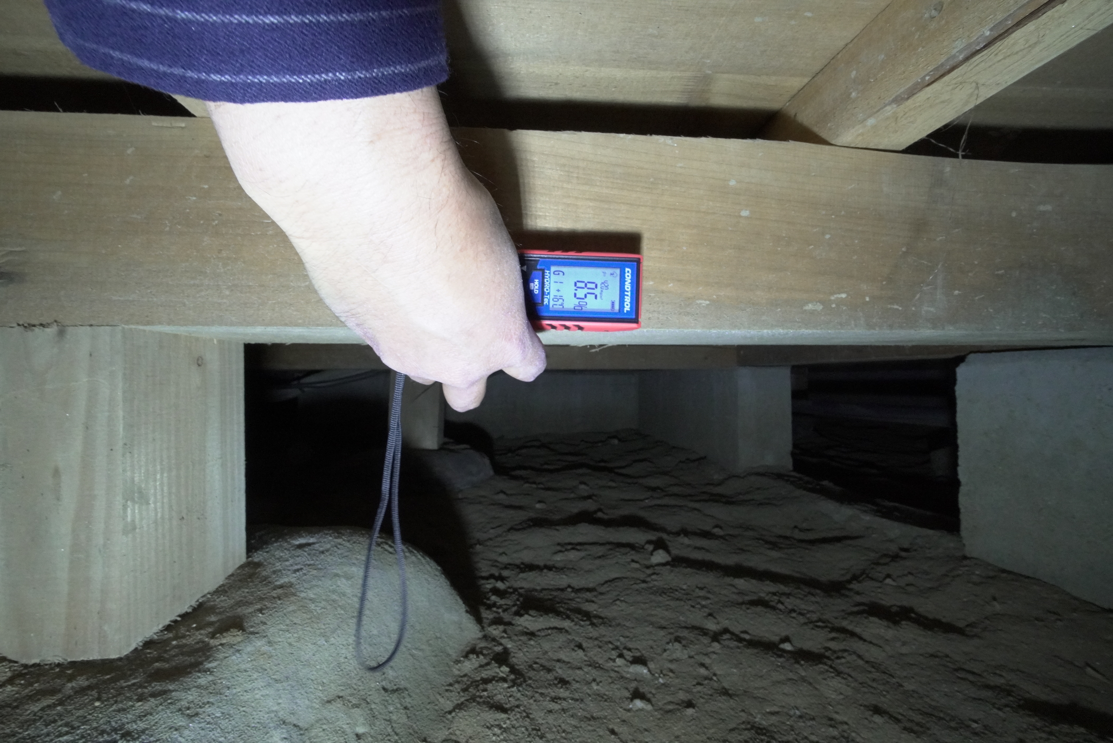 床下の湿度と木材の含水率を含水率計にて調査します。 湿気が多いとシロアリや木部の腐敗が多くなりやすいためです。 また、室内での床の傾斜(6/1000以下)をレーザー墨出器にて全体的に確認します。一方向に傾斜している場合は不動沈下が考えられますし、一部であれば床下の下地の問題による影響が考えられます。 |