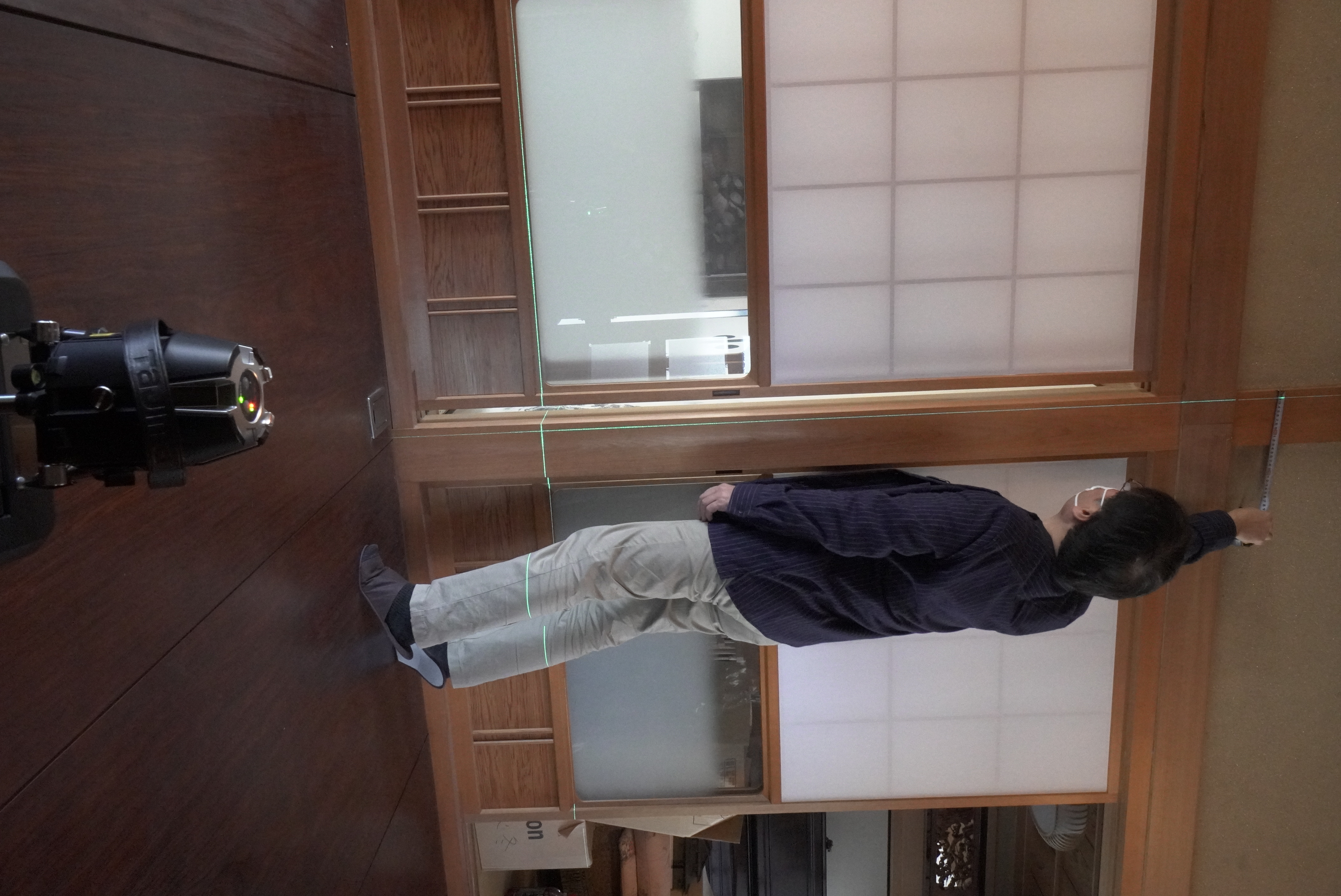 室内の壁や柱の傾斜をレーザー墨出器にて測ります。一方向に傾斜している場合は原因を突き止める必要がありますし、部分的であればリフォーム時に調整が必要です。(3m以上の区間で6/1000以上の傾斜がないかの調査を行う) |